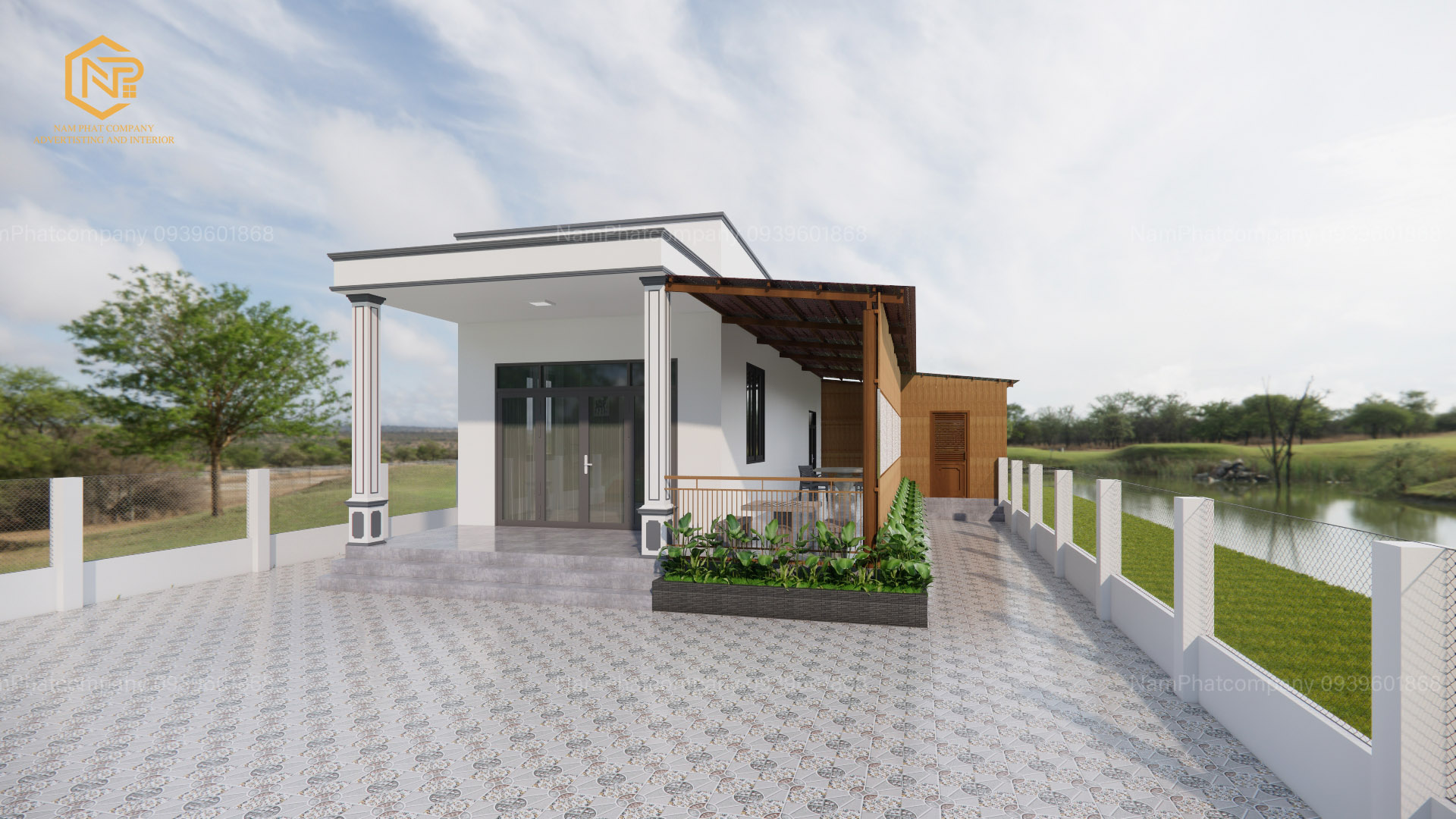 Phía trước ngôi nhà là khoảng sân rộng rãi, lát gạch hoa văn tinh tế, vừa tăng tính thẩm mỹ vừa đảm bảo sạch sẽ, dễ dàng vệ sinh. Bên hông nhà là khu vực hiên với mái che bằng gỗ, kết hợp lan can kim loại, tạo không gian thư giãn lý tưởng. Một vườn cây xanh nhỏ được bố trí hợp lý, mang lại sự cân bằng giữa kiến trúc và thiên nhiên.